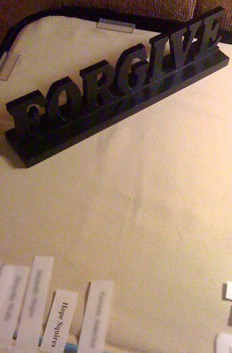 In addition to the papers scattered on the tables this year, someone had taken metal word sculptures (Amen, Blessing, etc.) and placed them along the tables as decoration. On one corner of one table sat the word “Forgive,” staring me down. I went straight to it, and here’s what I found: