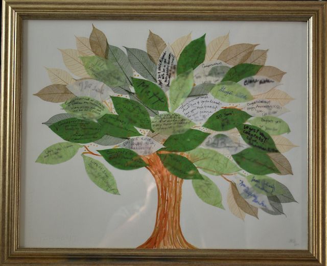 Despite my parents’ request for “no gifts,” we all chipped in for one very special art piece to give them – a family tree with paper leaves signed by as many family members as we could track down: