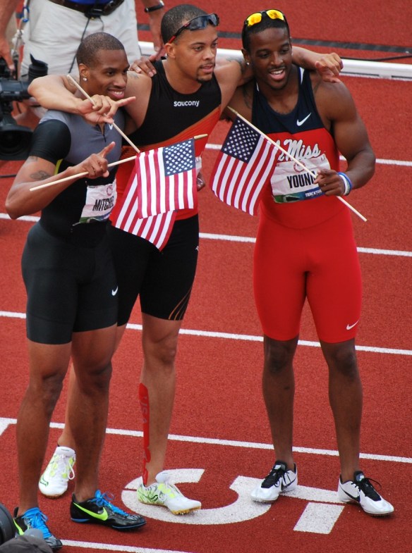 The men’s 200 meter winners. Wallace Spearmon (center) will have a chance at redemption in this year’s Olympics. In the ’08 Olympics, he had begun a victory lap thinking he had medaled, only to have officials disqualify him for stepping over the lane line.