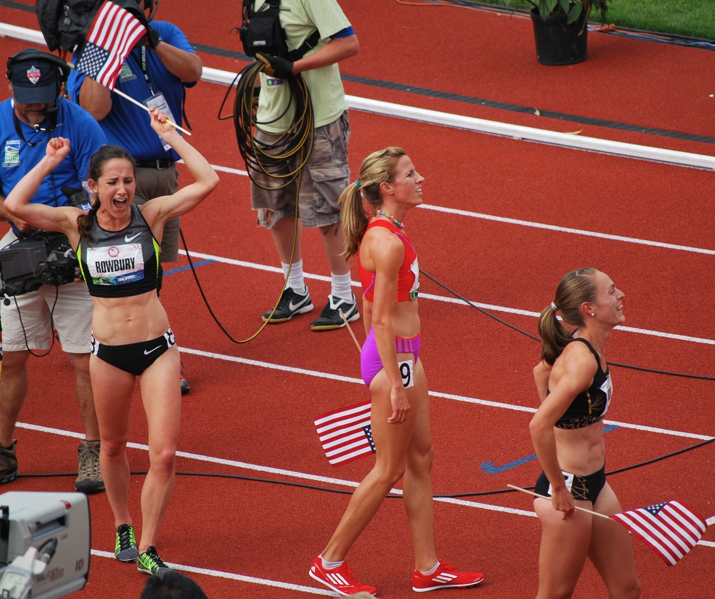 From left to right, Shannon Rowbury, Morgan Uceny and Jenny Simpson take a victory lap to celebrate making the women’s 1500 team.
