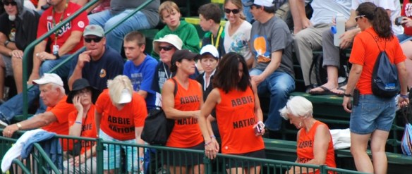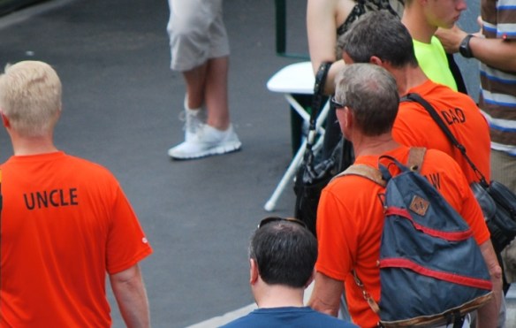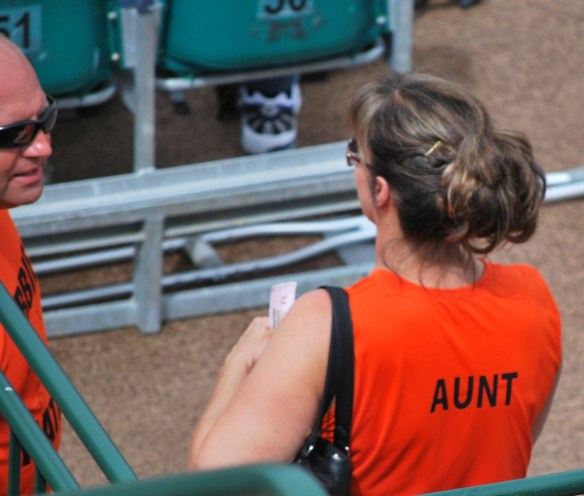 A few days later in the trials, I noticed a group of fans sitting a few sections to the right of me wearing “loud” orange t-shirts. It was a gathering of family and friends to cheer on heptathlete Abbie Stechschulte. The Register-Guard noticed the cheering section, too, and reported that 28 fans had come from her hometown in Ohio to cheer her on. What I especially loved were the backs of the shirts, printed with that person’s relationship to Stechschulte. It just so happened that “AUNT” was one of the first ones I saw: