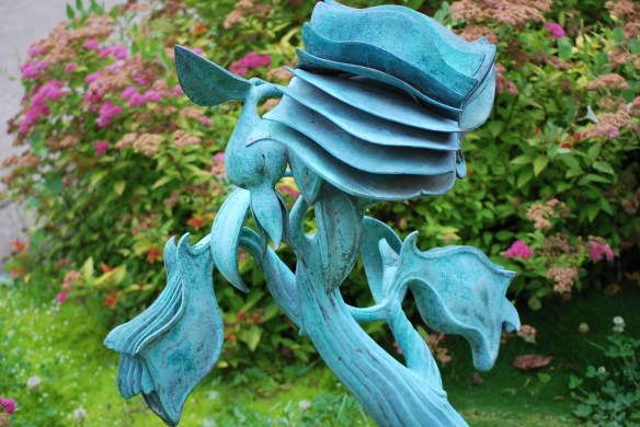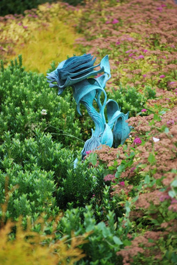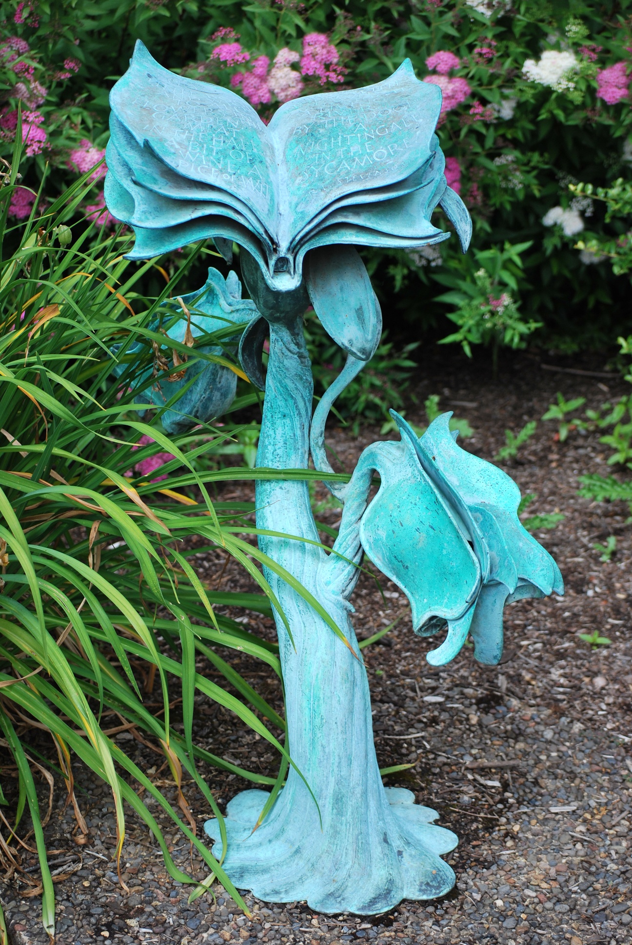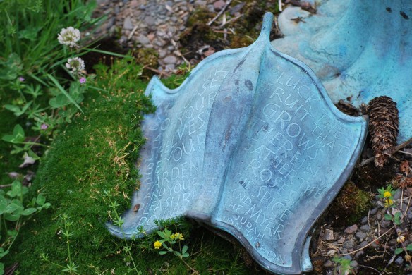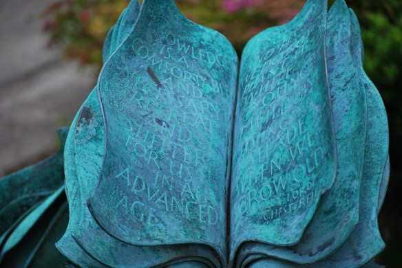 I was spellbound. Even from a distance, the sculptures looked intricate and enchanting, and I felt compelled to see them more closely. The close-up view of each was rewarding in its own way because each sculpture included either a quote etched into the book’s open pages or a page with a quote on the ground, as if a blossom or leaf had drifted down from the plant.