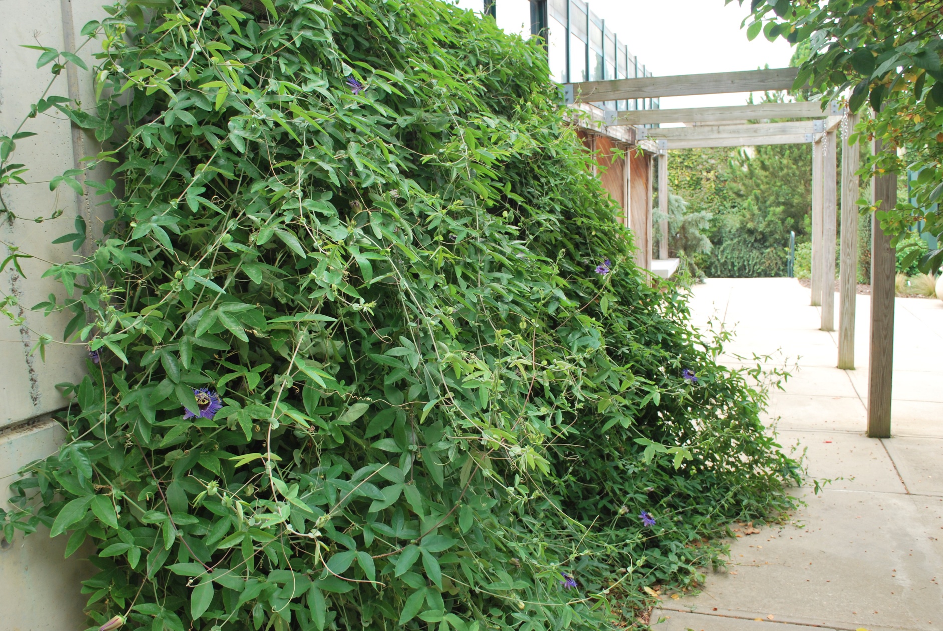 I finally found a sign for the flowers in this jumble of vines, but there were two types planted together, and so I don’t know if the ones I photographed are the “Purple Haze” variety or the “Monika Fischer” ones.