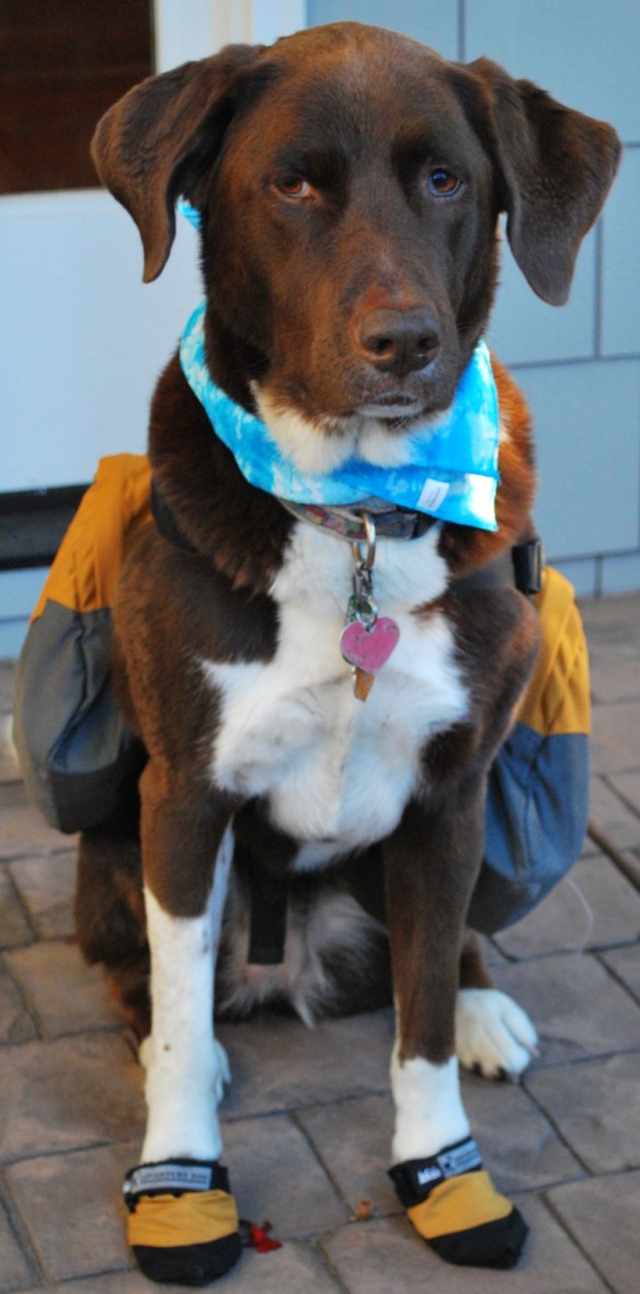 Thanks for ending this entry with that charming photo of your dog. My chocolate lab makes precisely the same facial expression when he knows how handsome he is 🙂 But I need to know how those boots stay on. Does he really wear them while you hike?