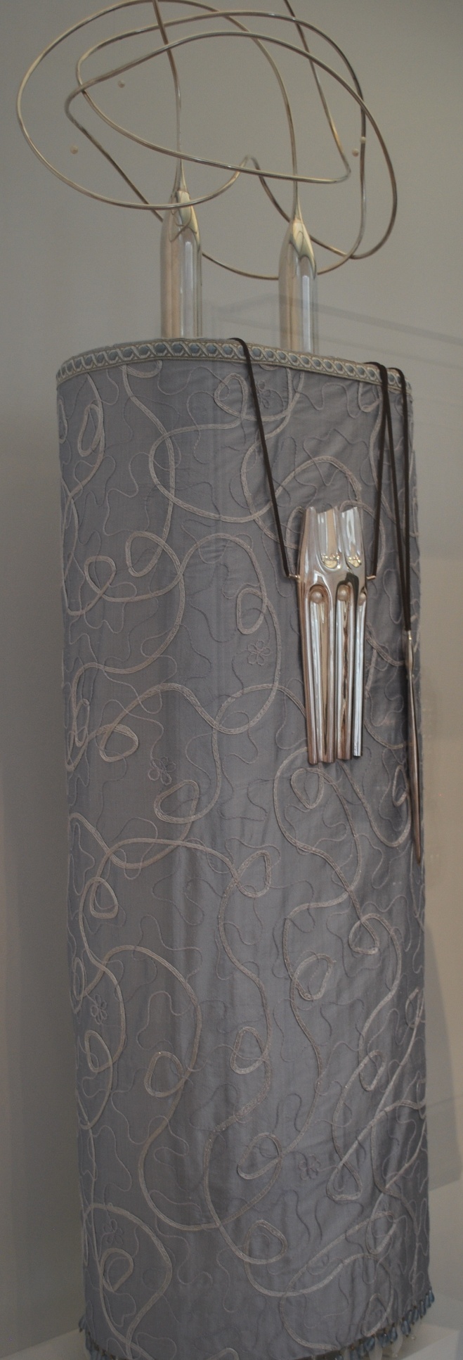 A Torah crown, mantle (the cloth), shield and pointer. There is a large ark at the front of the temple that houses the Torah in scrolls adorned and protected in this manner. The decorations range from modern as seen here to quite intricate and ornate, as seen below.