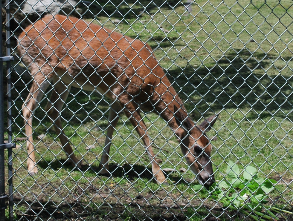 The next stop was the deer enclosure, where we watched another employee feed the deer peanut butter treats (some of the deer were quicker than others to get up from their afternoon rest to look for the goodies). Three of them came to see us at the back of their enclosure, where our guides gave them more goodies through the fence. I had no idea that deer love jewelweed, a weed that covers the mountains in that area. I guess I shouldn’t have been surprised, though. Deer seem to eat almost anything.