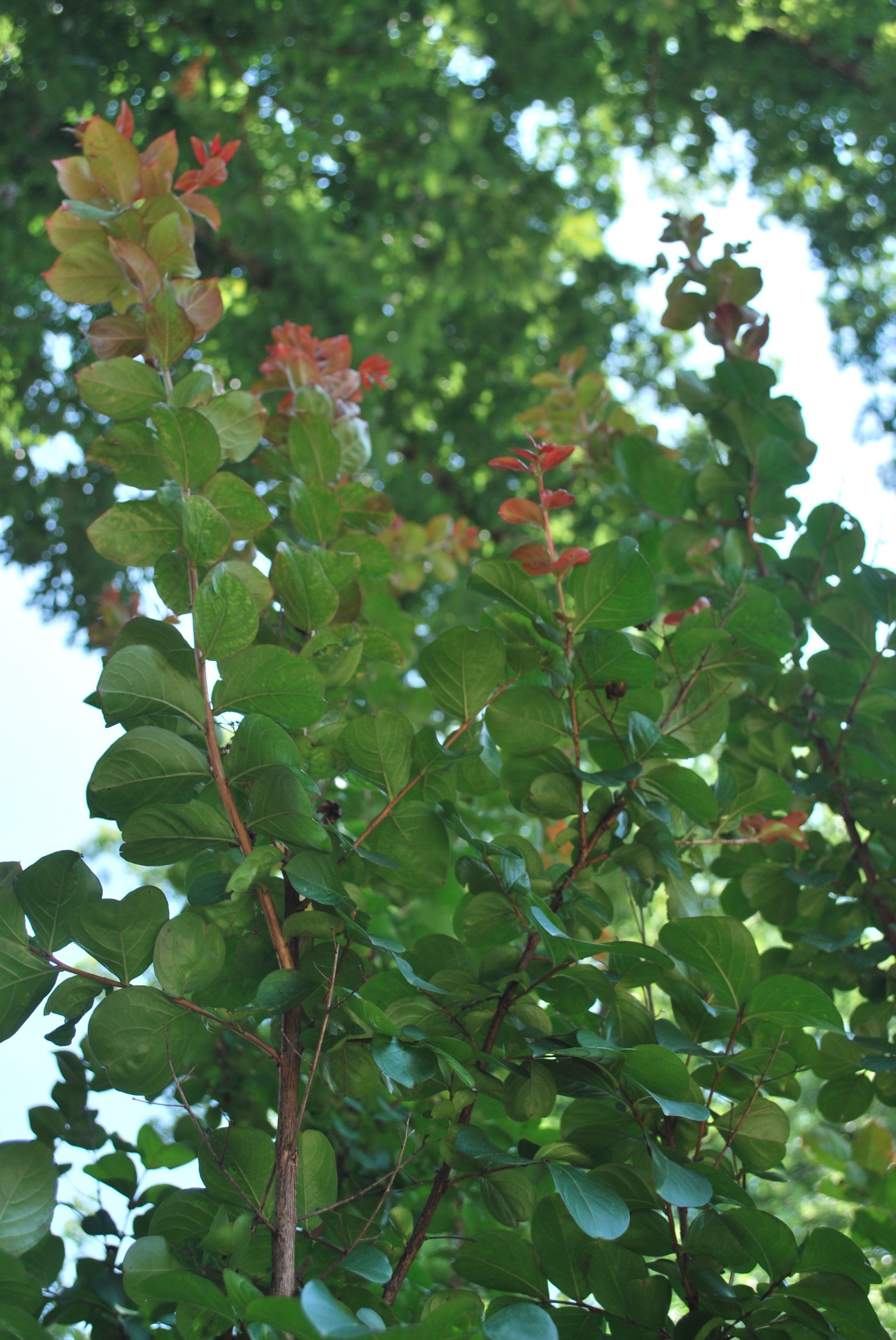 I don’t know if it’s the wetter-than-usual June we’ve had or the prolonged spring that encouraged it to shoot up, but it’s starting to take its place as a centerpiece of the garden. I’ll post pictures of its red blooms once they’re out. The crape myrtle has always been one of the last in the neighborhood to bloom, but I can already see the promise of the red flowers to come:
