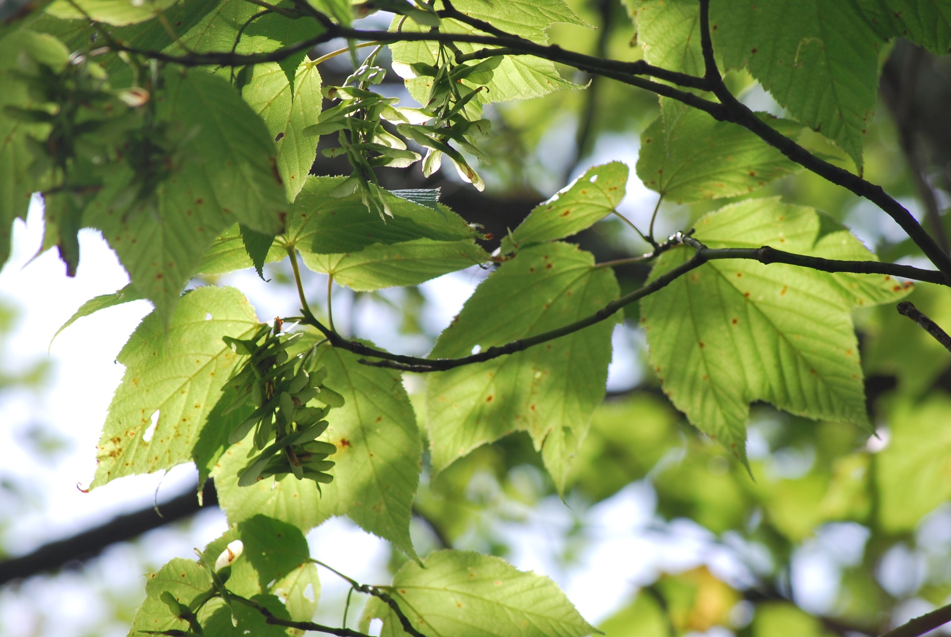 If my Leafsnap app is to be trusted, this is a striped maple, with its whirligig seedpods hanging down like grapes.