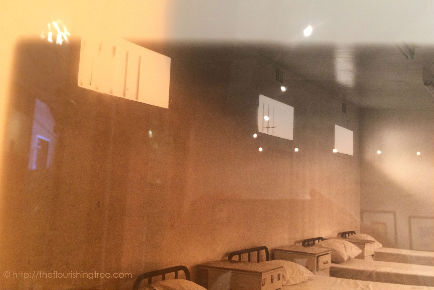 Etched into cool, frosted glass, this view greeted us before we stepped into the exhibit room – really just a pass-through area from one building to another – as if inviting us to enter into the prison itself: