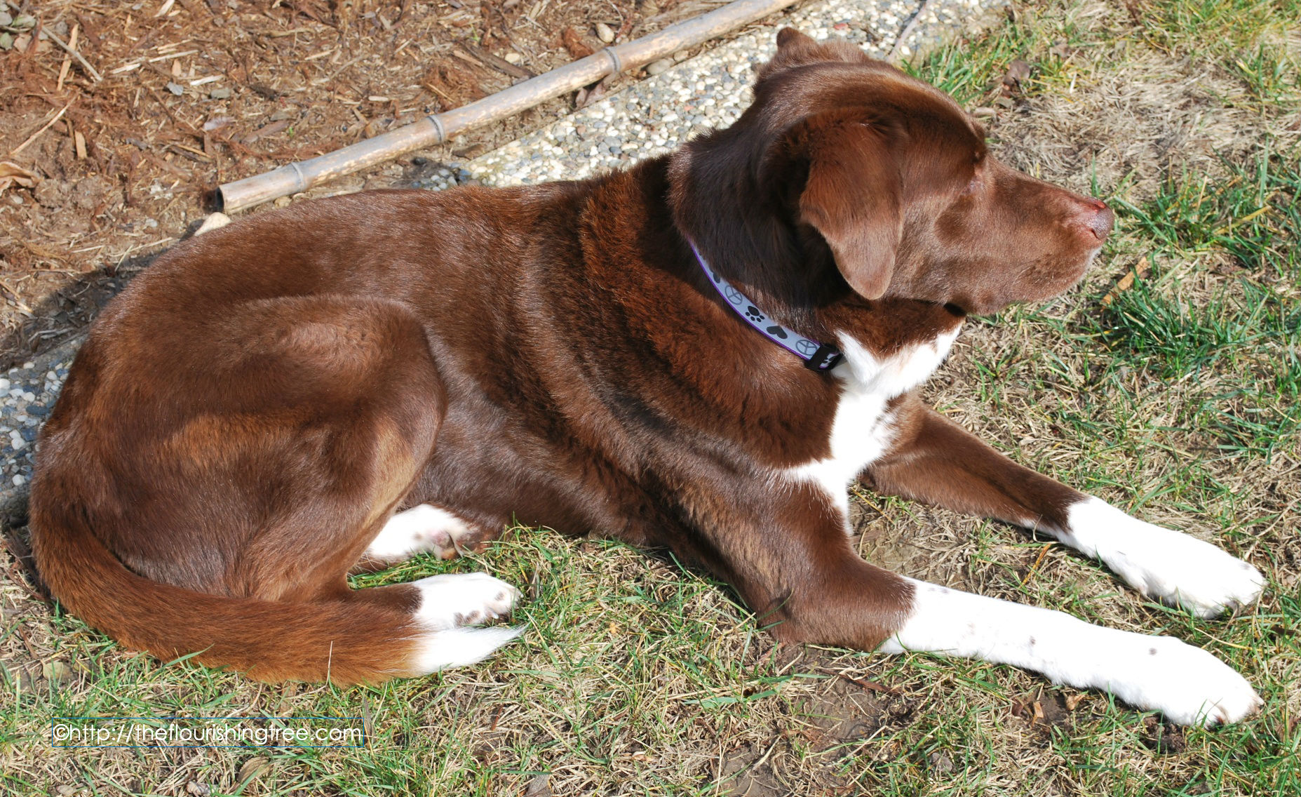 In good news, the sun is finally out today, working its magic on the laundry that is supposed to dry in the sun (door mats, towels, clothes my husband and I wore while cleaning the dog, the dog’s bedding, etc.). I didn’t give the dog even a partial bath today. And she is comfortable enough in the back yard to actually lie down in a sunny spot. In this picture, she’s down but alert, keeping an eye on the part of the yard where the skunking occurred. She’s still skittish in certain places outside, and when a branch from an orange tree brushed her when she walked by it earlier today, she jumped. Baby steps, I guess.