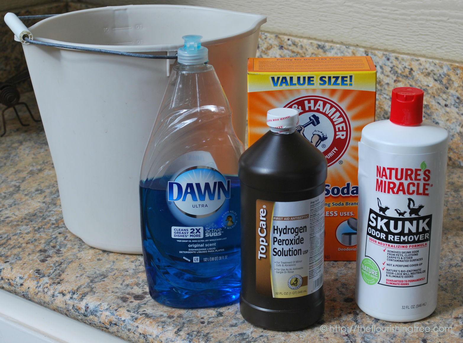 Mix and pour immediately on the dog, using rubber gloves to work up a lather (I used my bare hands and wished I hadn’t). Try to avoid the eyes and nose (hard to do when the dog takes the spray straight to the face). Some sites say to let stand for 5-10 minutes, but others say to remove immediately. I rinsed as quickly as possible and repeated several times before following up with dog shampoo and a towel dry. I did this all again Monday morning, and then Monday afternoon started with the skunk product from the pet store. I recommend dipping the dog’s feet completely into the bucket for maximum coverage.