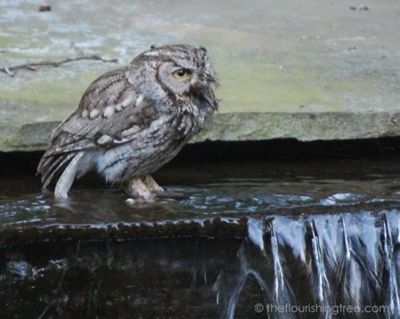 Yes, this is the first year I’ve seen an owl at the waterfall or by the pond at all. In the past, during evening fish feedings, an owl will sometime swoop by overhead, but I’ve never seen them land near or in the pond or waterfall like this before. It was a very hot day, though. I can’t blame the owl for wanting a cool drink of water. 🙂