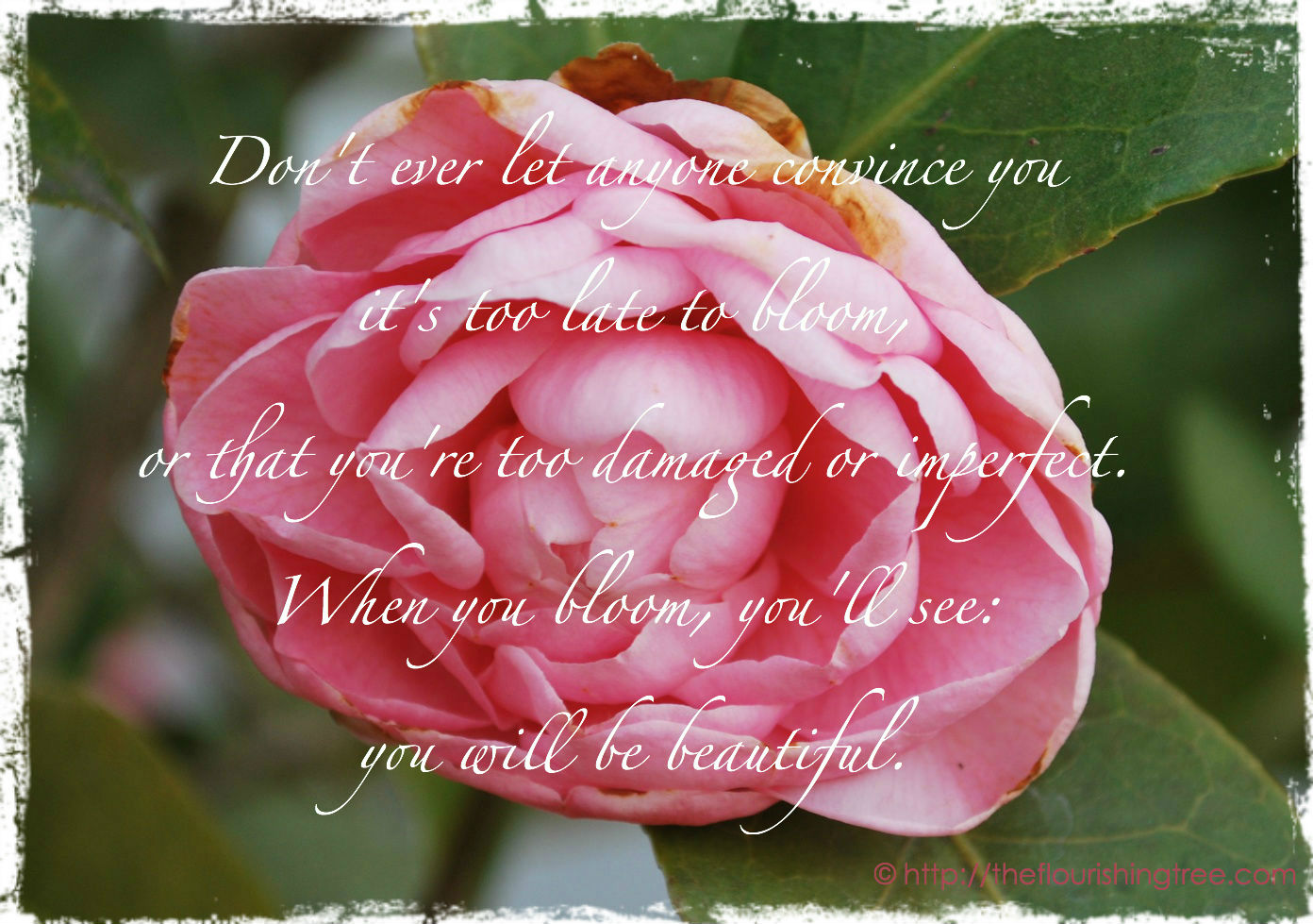 So to those of you who feel like late bloomers, who feel like that tightly closed bud on the camellia bush that may or may not open, I say to you: Let yourself bloom. Don’t ever let anyone convince you it’s too late to bloom, or that you’re too damaged or imperfect. When you bloom, you’ll see: you will be beautiful.