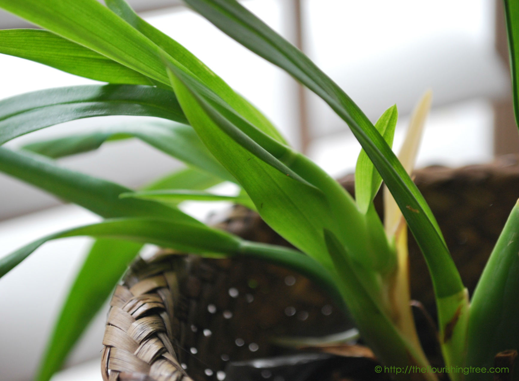 My secret is that I’m following my mother-in-law’s advice and spraying them with a bottle filled with water and orchid food. These are the first two orchids I’ve managed to keep alive for any length of time, and I was happy a few weeks back when I noticed the one from my husband had sprouted new leaves. I’m optimistic, but even if there are no new blooms, I’m content that it’s still living and growing after more than two years here.
