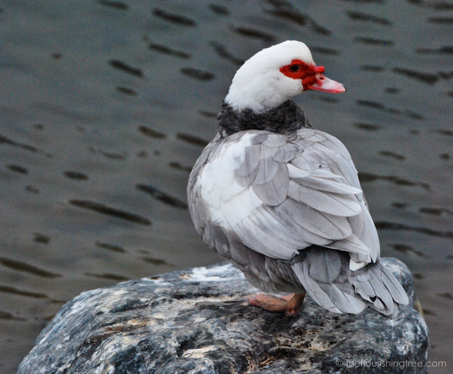 I love the play of white and gray feathers and white and gray streaks in the rock, but mostly I love the bright red of the duck’s beak and eye area.